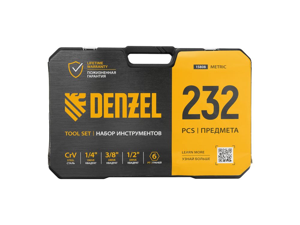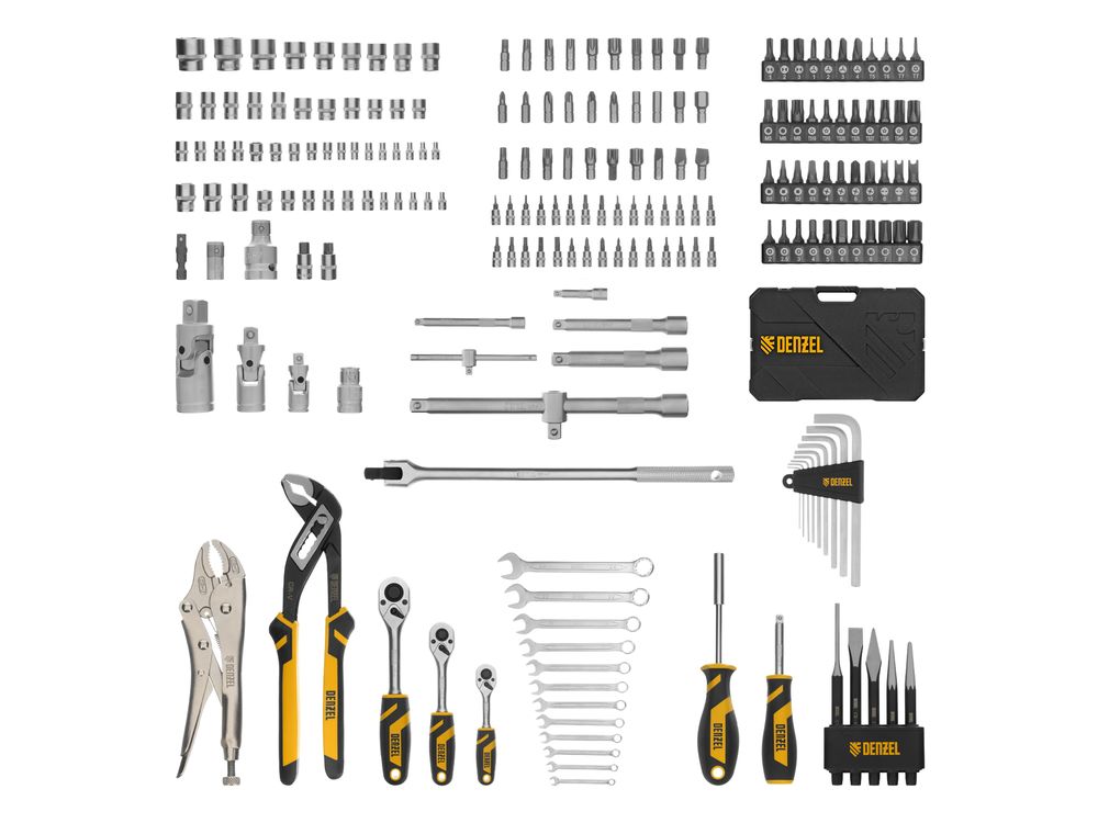 Набор инструментов Denzel 15808 состоит из 232 предметов с присоединительными квадратами 1/4, 1/2, 3/8, упакованных во вместительный ударопрочный кейс собственной разработки с антивандальным покрытием. В комплект поставки входят инструменты и оснастка для монтажа и демонтажа резьбовых соединений, а также кернер, бородок, зубило, крейцмейсель, выколотка и переставные клещи для выполнения слесарных и сантехнических работ. Набор предназначен для профессионального использования в автомастерской, будет полезен и для решения бытовых вопросов.