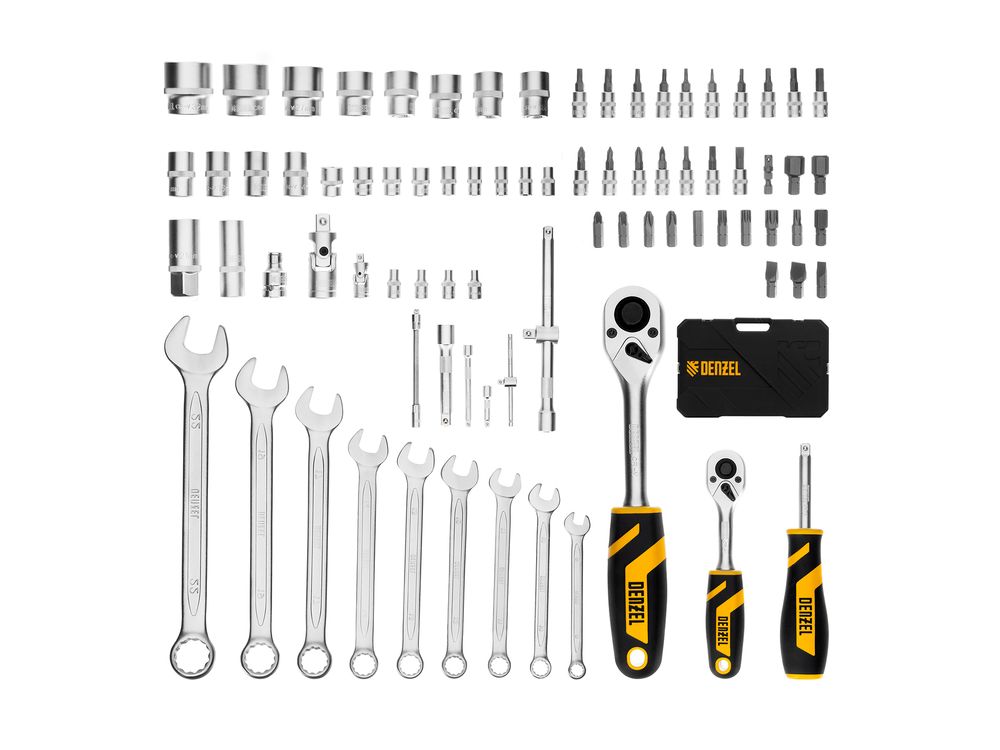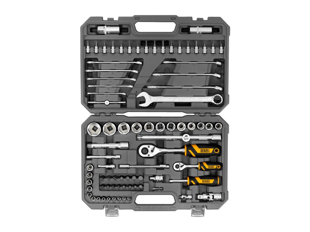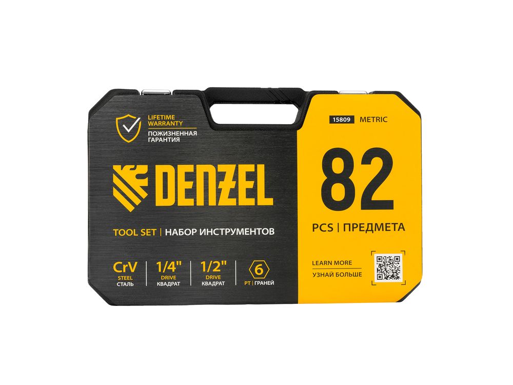 Набор инструментов Denzel 15809 состоит из 82 предметов с присоединительными квадратами 1/4, 1/2, упакованных во вместительный ударопрочный кейс собственной разработки с антивандальным покрытием. В комплект поставки входят инструменты и оснастка для монтажа и демонтажа резьбовых соединений. Набор предназначен для профессионального использования в автомастерской, будет полезен и для решения бытовых вопросов.