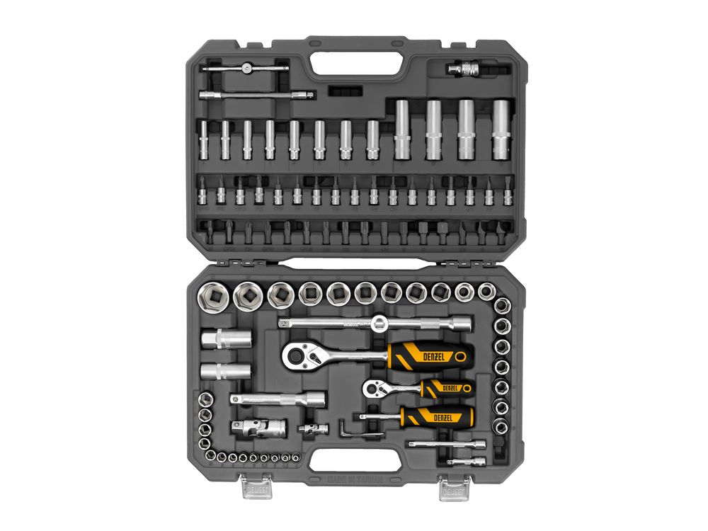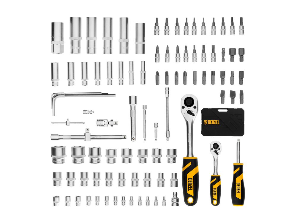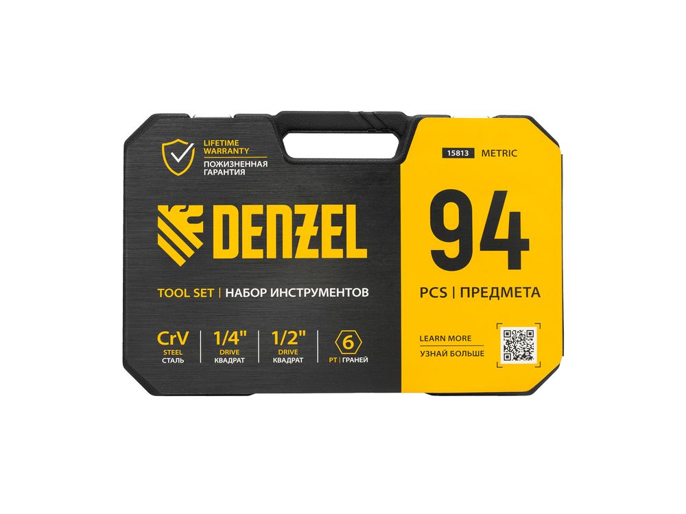 Набор инструментов Denzel 15813 состоит из 94 предметов с присоединительными квадратами 1/4, 1/2, упакованных во вместительный ударопрочный кейс собственной разработки с антивандальным покрытием. В комплект поставки входят инструменты и оснастка для монтажа и демонтажа резьбовых соединений. Набор предназначен для профессионального использования в автомастерской, будет полезен и для решения бытовых вопросов.