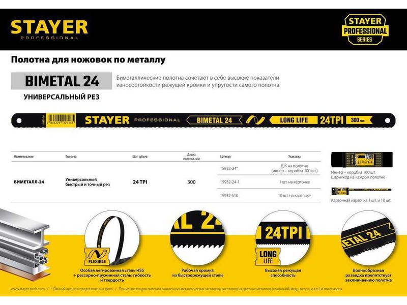 Купить Полотно STAYER "PROFI" "STAYER-FLEX" по металлу, биметаллическое, 24TPI, 300 мм, 10 шт