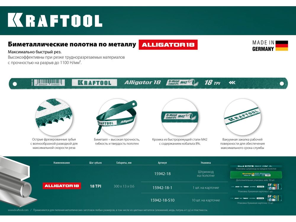 Биметаллическое полотно по металлу, 18 TPI: быстрый рез, 300 мм, гибкое, волнообразная разводка. 1 шт, коробка 50 шт, KRAFTOOL Alligator-18 |