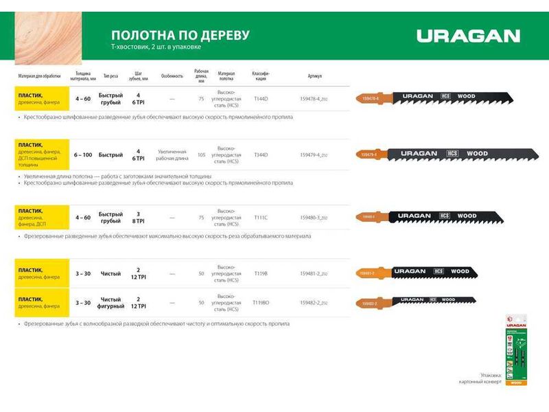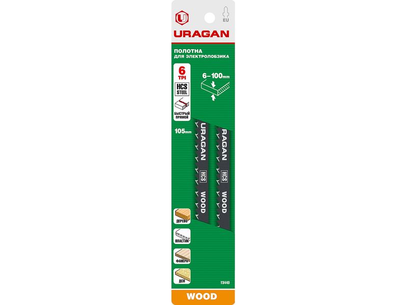 Полотна URAGAN T344D, HCS, 159479-4, по дереву, T-хвост.,шаг 4мм, 132/105мм, 2шт-418