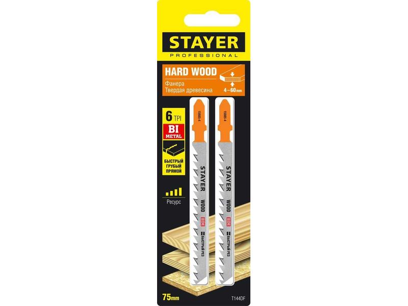 Полотна STAYER, T144DF, для эл/лобзика, Bi-Metal, по дереву, ДВП, ДСП, T-хвост., шаг 4мм, 75мм, 2шт-418