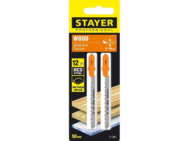 Полотна STAYER, T119BO, для эл/лобзика, HCS, по дереву, ДСП, фигур. рез, T-хвост., шаг 2мм, 50мм, 2шт-418