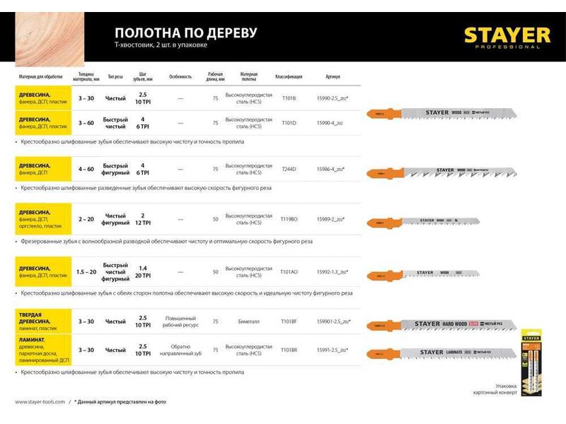 Купить Полотна STAYER, T101BF, для эл/лобзика, Bi-Metal, по твердому дереву, T-хвост., шаг 2,5мм, 75мм, 2шт