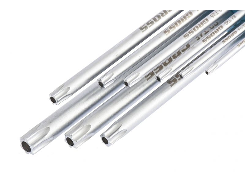 Набор Gross 16408 из стали S2 включает в себя 9 экстрадлинных сатинированных имбусовых ключей для работы с крепежом, имеющим шлицы Torx и Tamper-Torx T10-T50. Благодаря увеличенной длине и Г-образной форме ключи позволяют действовать в труднодоступных местах и экономить усилия при монтаже и демонтаже крепежа. Набор пригодится для ремонта электроприборов.