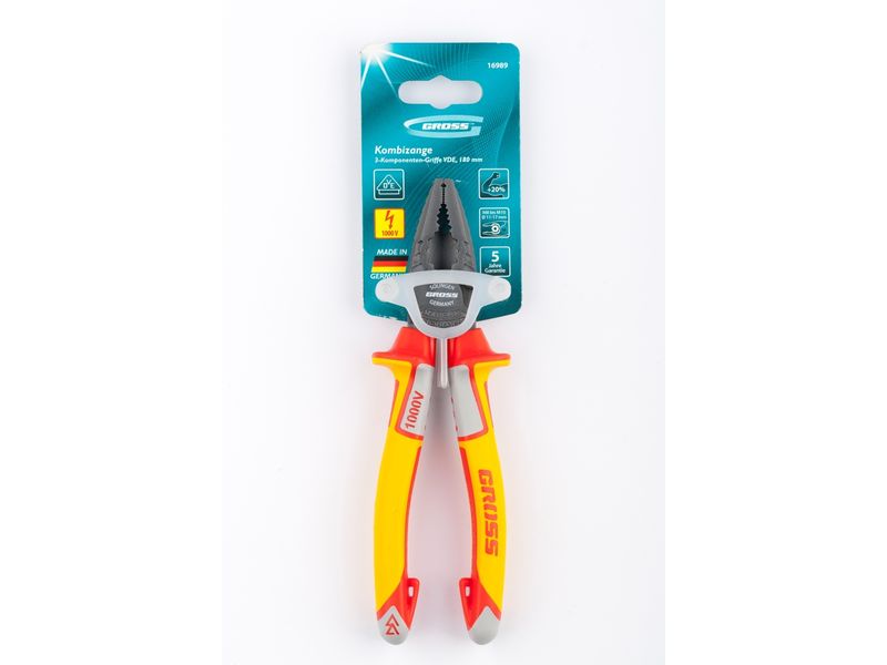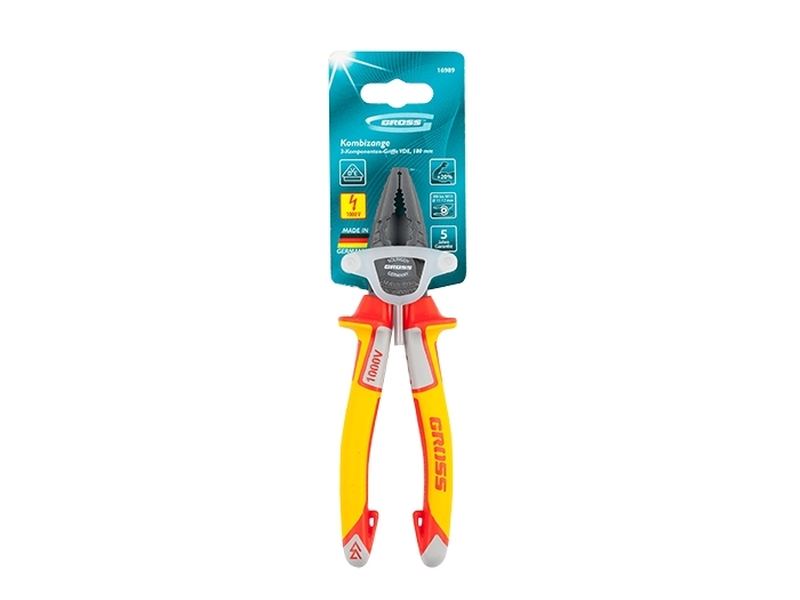 Комбинированные плоскогубцы Gross 16989 длиной 180 мм, с диэлектрическими трехкомпонентными рукоятками, выдерживающими до 1000 В, рассчитаны на работу с токопроводящими элементами. С их помощью можно захватить, перекусить или согнуть мелкие и крупные детали. Также плоскогубцы можно использовать в качестве гаечного ключа. Инструмент станет незаменимым помощником слесарям и монтажникам при работе с различным оборудованием и материалами. Перед началом работ следует отключить напряжение.