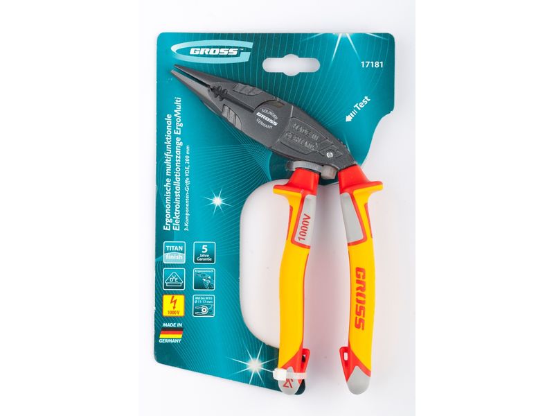 Комбинированные длинногубцы с изогнутой головой Gross 17181, 200 мм, с диэлектрическими рукоятками, предназначены для работы с мелкими компонентами и крепежами в малодоступных местах. Конструкция рабочей части позволяет использовать инструмент для зачистки и опрессовки одножильных и многожильных проводов сечением 1,5 и 2,5 мм, а также в качестве гаечного ключа для резьбовых соединений М8-М10. Инструмент подходит для монтажа и ремонта электрических сетей, ремонта автомобилей, выполнения слесарных работ.