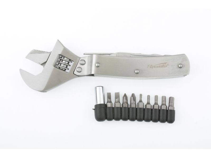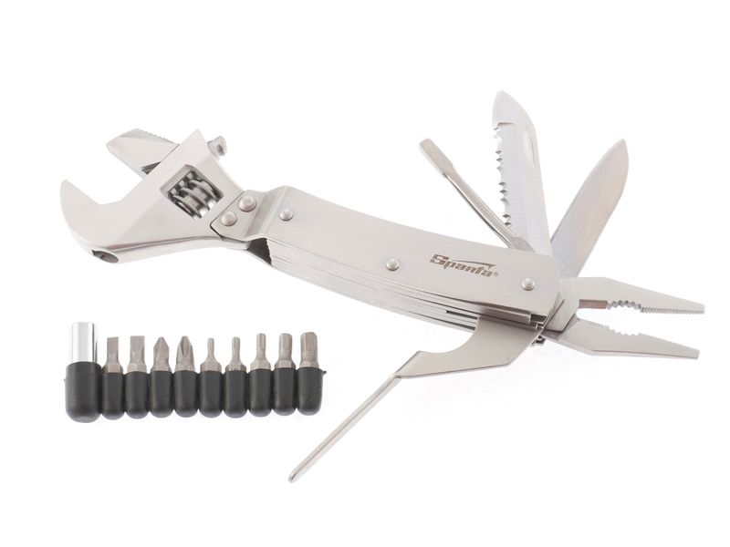 Трансформер Sparta 176065 длиной 170 мм включает в себя 8 предметов и позволяет успешно решать самые разные задачи. Ножом можно разрезать веревку или картон, напильником — заточить рыболовный крючок. Многофункциональный набор включает также разводной ключ, пассатижи и биты, необходимые для выполнения слесарных работ. Его можно использовать дома, на даче, в гараже, а также в походе, на охоте или рыбалке.