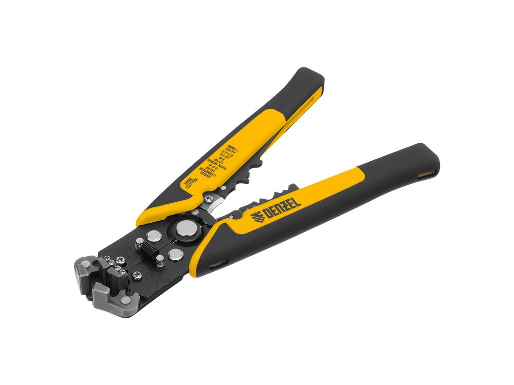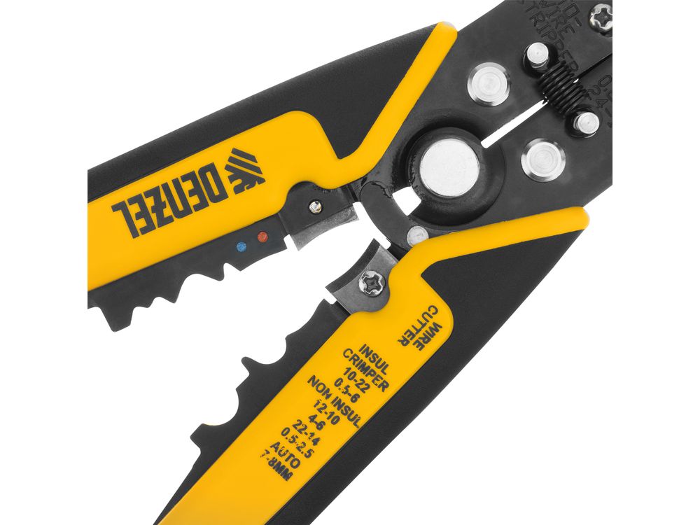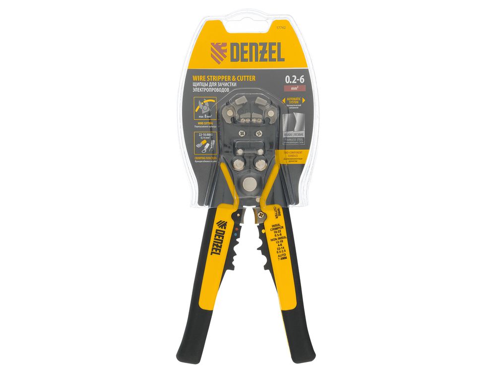 Щипцы Denzel 17742 — инструмент для зачистки электропроводов сечением 0,2-6 мм2 (22-10 AWG), способный дополнительно выполнять функцию обрезания проводов. Используется при проведении электромонтажных работ, подходит для профессионального применения.