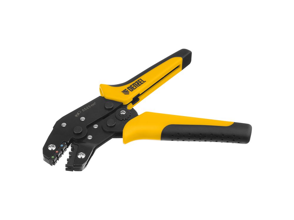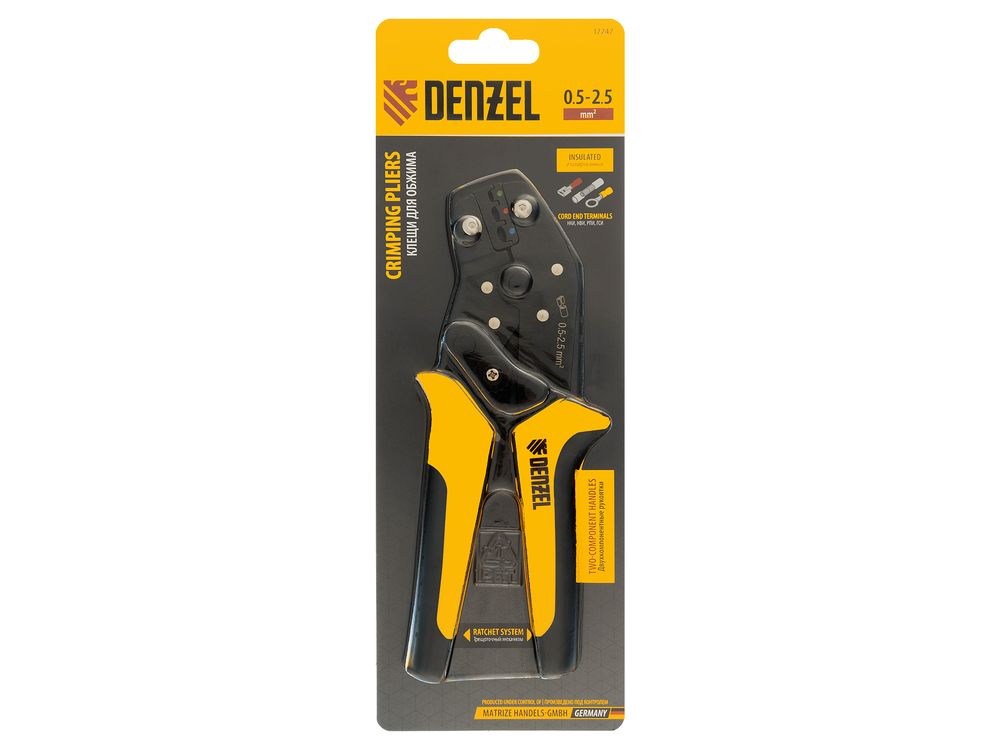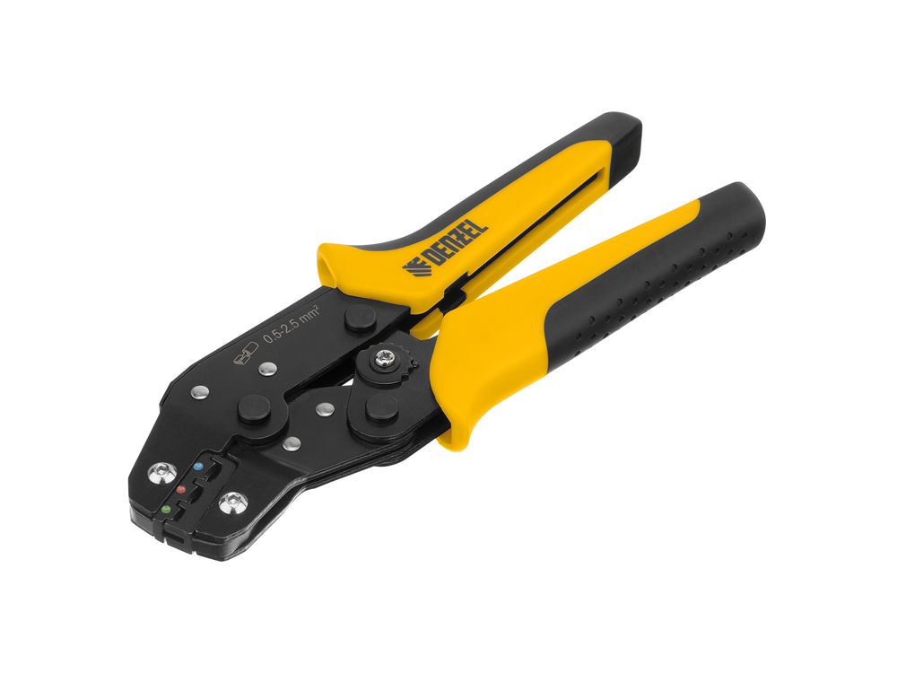 Клещи Denzel 17747 предназначены для обжима изолированных кольцевых наконечников НКИ и вилочных НВИ, разъемов плоских РПИ, гильз соединительных ГСИ сечением 0,5-2,5 мм2. Инструмент пригодится частным и профессиональным мастерам при проведении электромонтажных работ.
