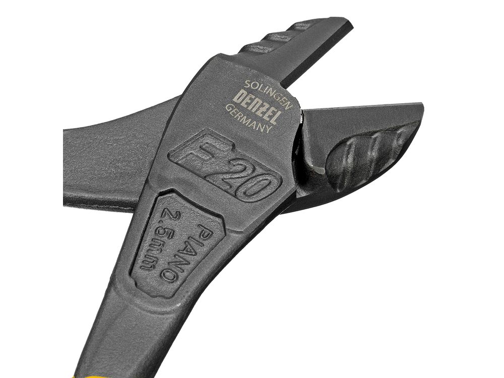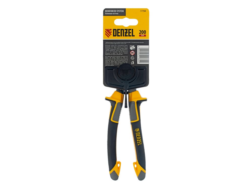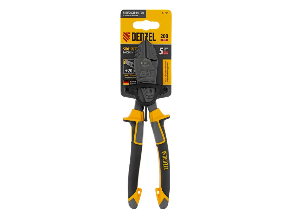 Усиленные бокорезы Denzel 17784 длиной 200 мм, с трехкомпонентными рукоятками, предназначены для разрезания кабелей, проводов, гвоздей и проволоки средней (750 Н/мм2) и высокой жесткости (1800 Н/мм2) диаметром 4 и 2,8 мм соответственно. Подходят для резки рояльных струн (предел прочности 2300 Н/мм2) диаметром до 2,5 мм. Успешно справляются не только с медными, алюминиевыми и пластмассовыми деталями, но и с более жесткими стальными элементами. Встроенный рычажный механизм и смещенный непосредственно к режущим кромкам шарнир увеличивают усилие реза на 20%.