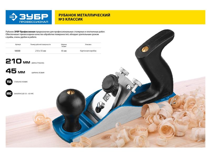 Купить Рубанок ЗУБР ЭКСПЕРТ металлический, литой, с регулируемым лезвием 45мм, модель 3 Классик, 210х55мм