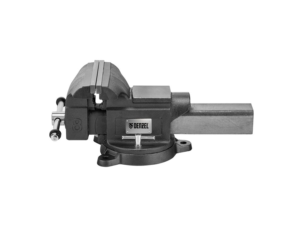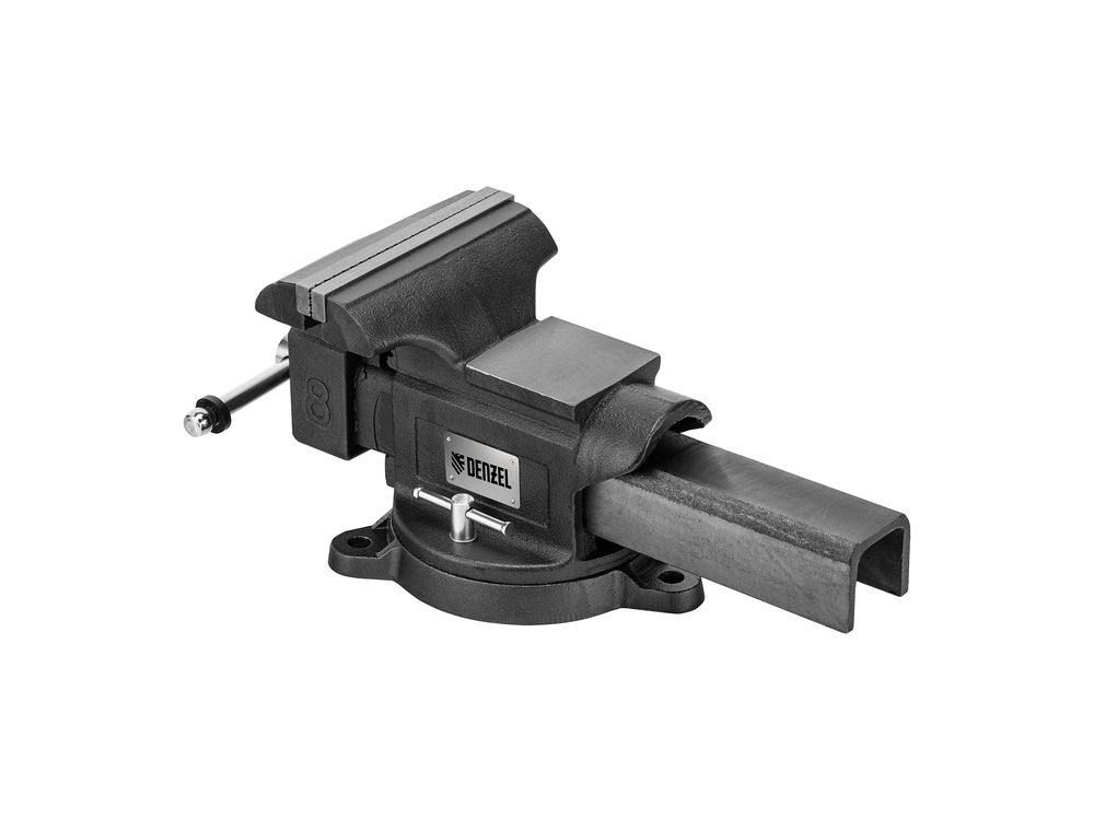 Слесарные поворотные тиски Denzel BVH-200 18686 с губками шириной 200 мм и стальной направляющей предназначены для фиксации деталей и заготовок, а также для выполнения мелких ударных работ — в конструкции предусмотрена наковальня. Рабочий ход составляет 200 мм, глубина зажима — 90 мм. Специальный зажим позволяет фиксировать трубы диаметром 25-64 мм, что расширяет возможности использования инструмента. На губки можно установить защитные накладки (приобретаются отдельно) для предотвращения повреждения зажимаемых предметов. Тиски пригодятся в мастерской и гараже.