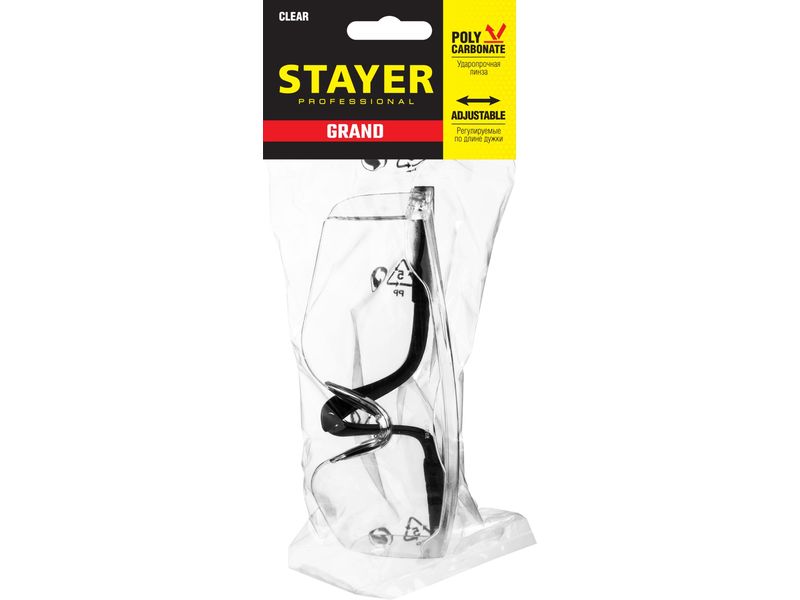 STAYER GRAND Прозрачные, очки защитные открытого типа, регулируемые по длине дужки.
