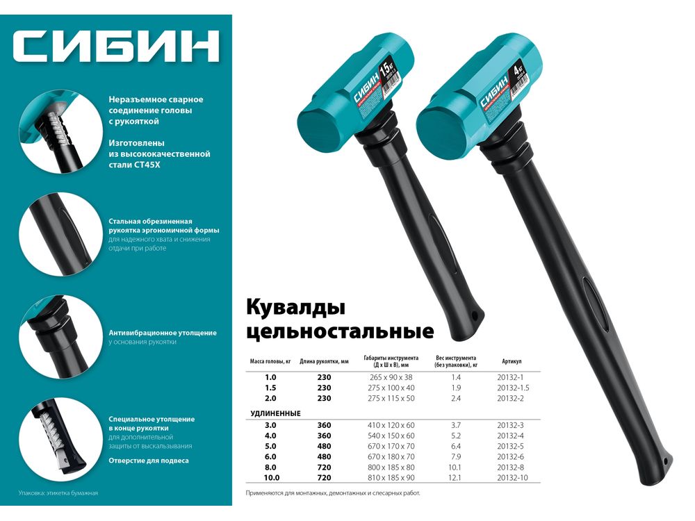 Цельностальная кувалда с удлинённой рукояткой СИБИН 10 кг 720 мм-11