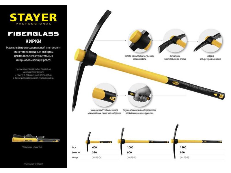 Кирка 1000г с фиберглассовой рукояткой, STAYER Professional 20179-10-495