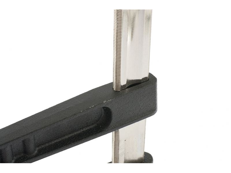 Двойной опорный кронштейн установлен на направляющей жестко, другой перемещается для регулировки захвата и оснащен винтовым зажимом. Кронштейны губок имеют стойкое к коррозии порошковое покрытие. Губки снабжены накладками для защиты обрабатываемых предметов от повреждений. Обрезиненная рукоятка удобна в работе. Предназначена для фиксации деталей при обработке и сборке.
