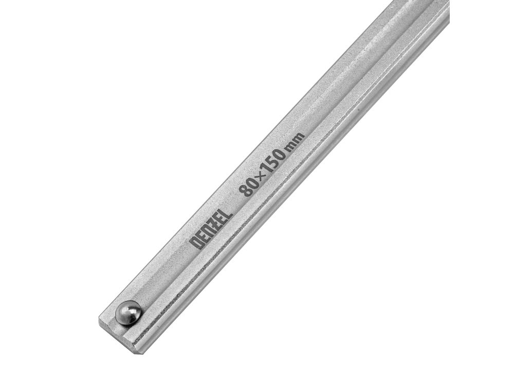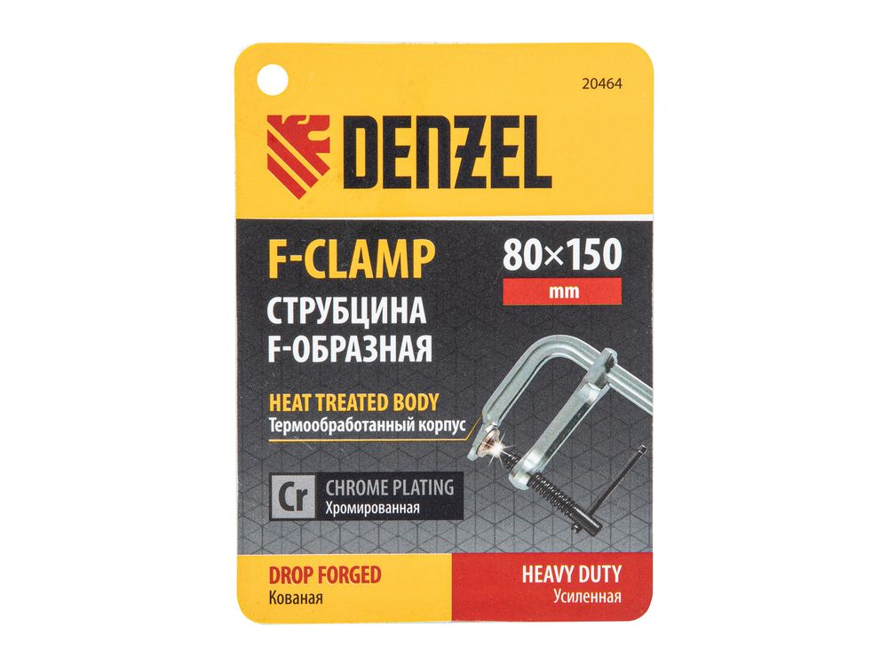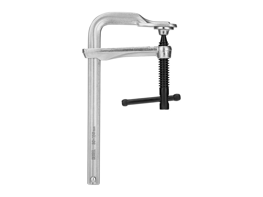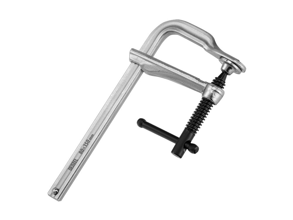 Кованая F-образная струбцина Denzel 20464 с глубиной зажима 80 мм, усиленная, предназначена для фиксации деталей шириной до 150 мм и материалов при проведении слесарных, столярных и сварочных работ. Тавровый профиль обеспечивает устойчивость конструкции к изгибу, что позволяет фиксировать детали со значительным усилием. Струбцина подходит для профессионального применения.