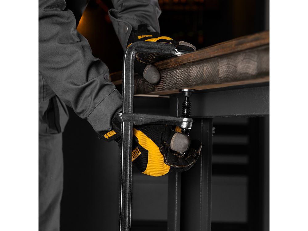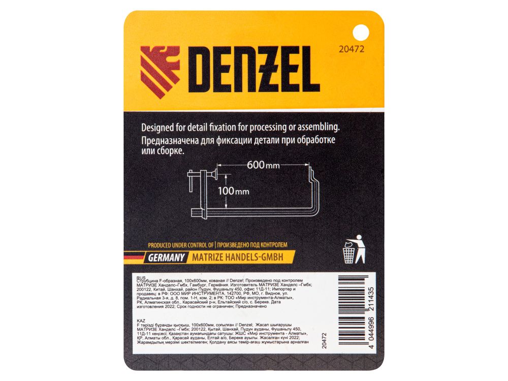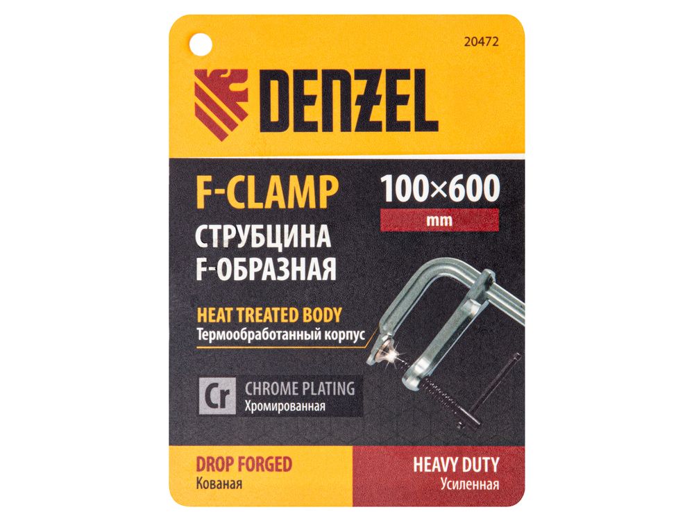 Кованая F-образная струбцина Denzel 20472 с глубиной зажима 100 мм, усиленная, предназначена для фиксации деталей шириной до 600 мм и материалов при проведении слесарных, столярных и сварочных работ. Тавровый профиль обеспечивает устойчивость конструкции к изгибу, что позволяет фиксировать детали со значительным усилием. Струбцина подходит для профессионального применения.