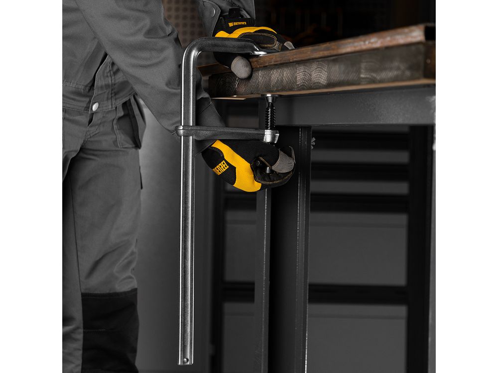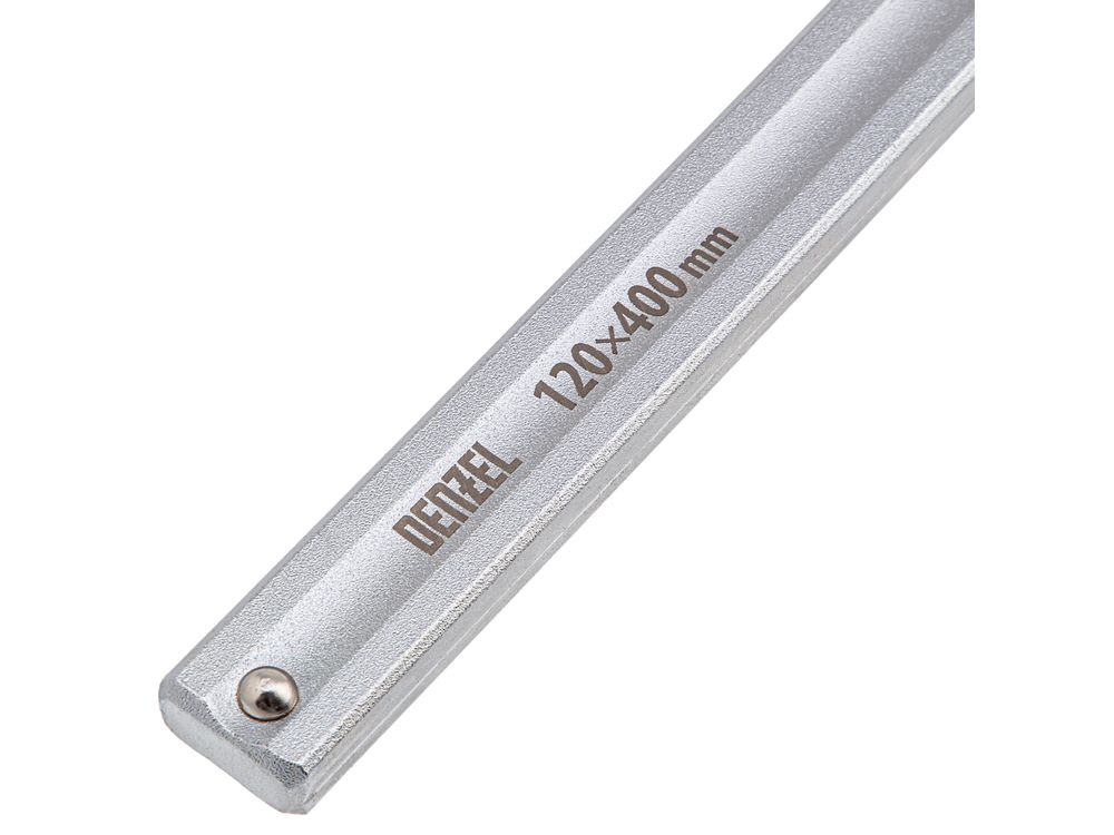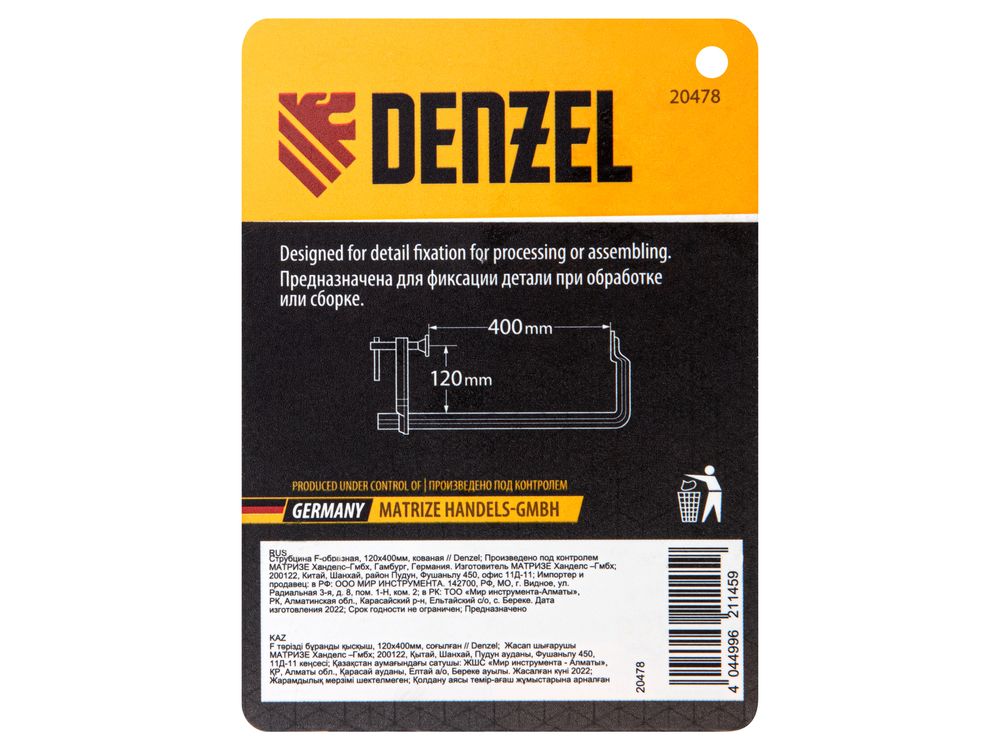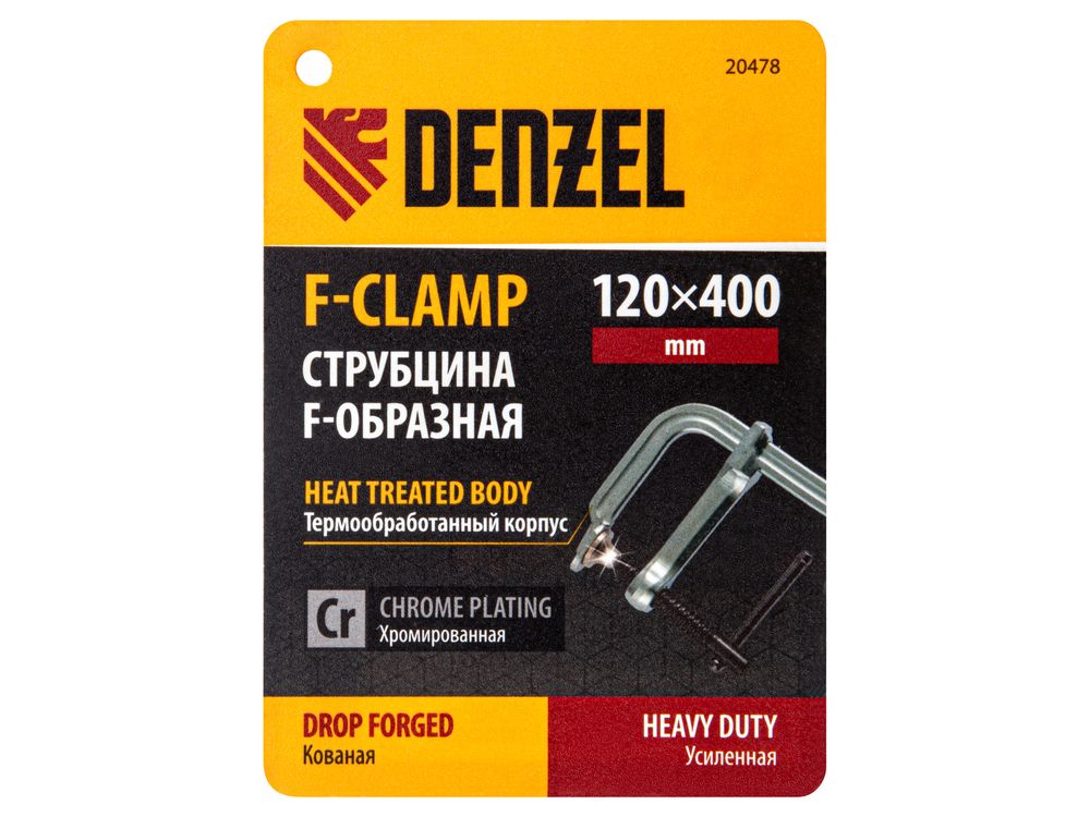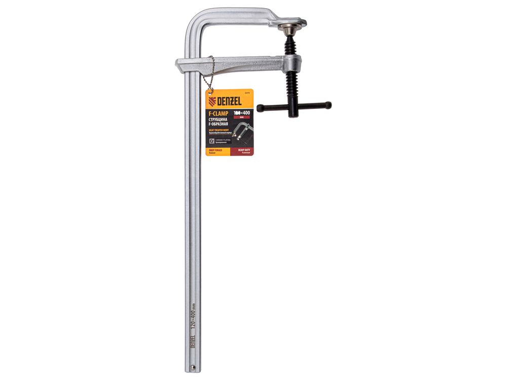 Кованая F-образная струбцина Denzel 20478 с глубиной зажима 120 мм, усиленная, предназначена для фиксации деталей шириной до 400 мм и материалов при проведении слесарных, столярных и сварочных работ. Тавровый профиль обеспечивает устойчивость конструкции к изгибу, что позволяет фиксировать детали со значительным усилием. Струбцина подходит для профессионального применения.