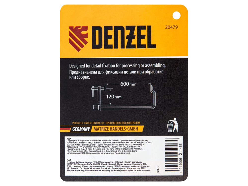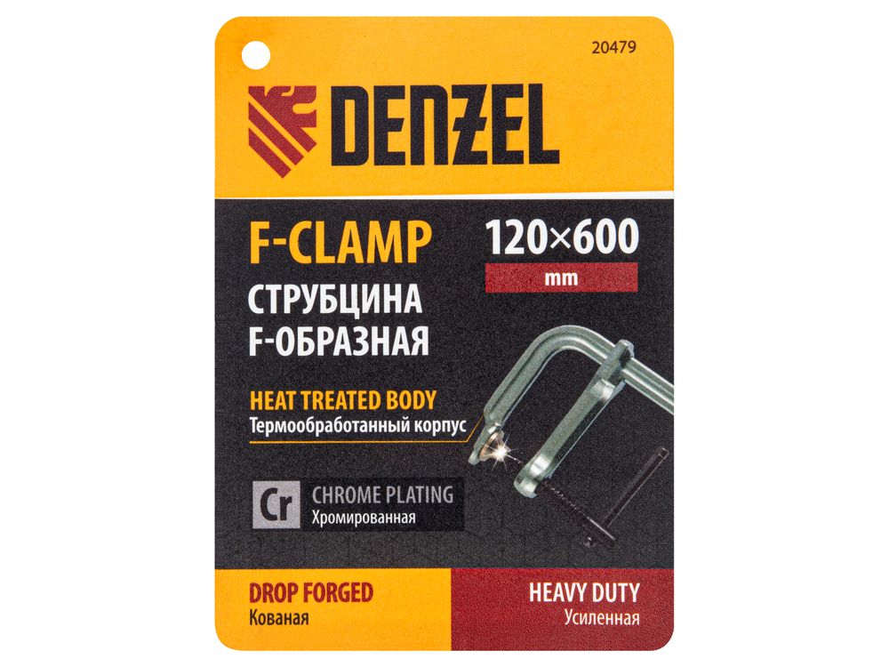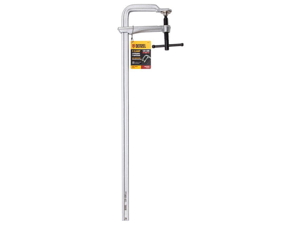 Кованая F-образная струбцина Denzel 20479 с глубиной зажима 120 мм, усиленная, предназначена для фиксации деталей шириной до 600 мм и материалов при проведении слесарных, столярных и сварочных работ. Тавровый профиль обеспечивает устойчивость конструкции к изгибу, что позволяет фиксировать детали со значительным усилием. Струбцина подходит для профессионального применения.