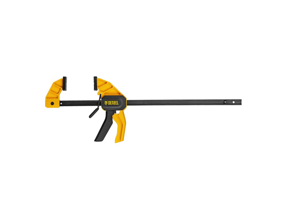 Струбцина F-образная быстрозажимная Denzel 20502 с пошаговым зажимом шириной 300 мм и глубиной 55 мм, с усиленным нейлоновым корпусом, позволяет прочно зафиксировать детали для их обработки, склеивания и выполнения других задач. Сила сжатия составляет 680 Н. Струбцина подходит для бытового и профессионального применения.