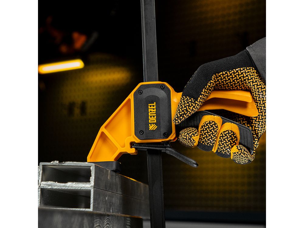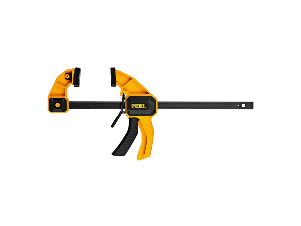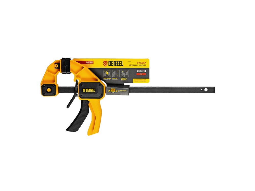Струбцина F-образная быстрозажимная Denzel 20506 с пошаговым зажимом шириной 300 мм и глубиной 80 мм, с усиленным нейлоновым корпусом, позволяет прочно зафиксировать детали для их обработки, склеивания и выполнения других задач. Сила сжатия составляет 1300 Н. Струбцина подходит для бытового и профессионального применения.