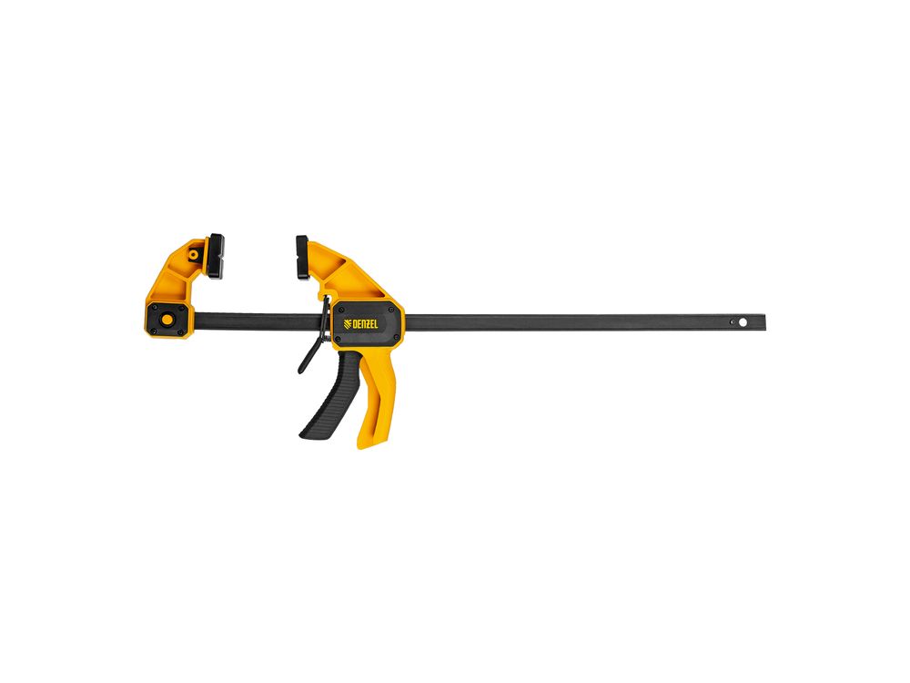 Струбцина F-образная быстрозажимная Denzel 20507 с пошаговым зажимом шириной 450 мм и глубиной 80 мм, с усиленным нейлоновым корпусом, позволяет прочно зафиксировать детали для их обработки, склеивания и выполнения других задач. Сила сжатия составляет 1300 Н. Струбцина подходит для бытового и профессионального применения.