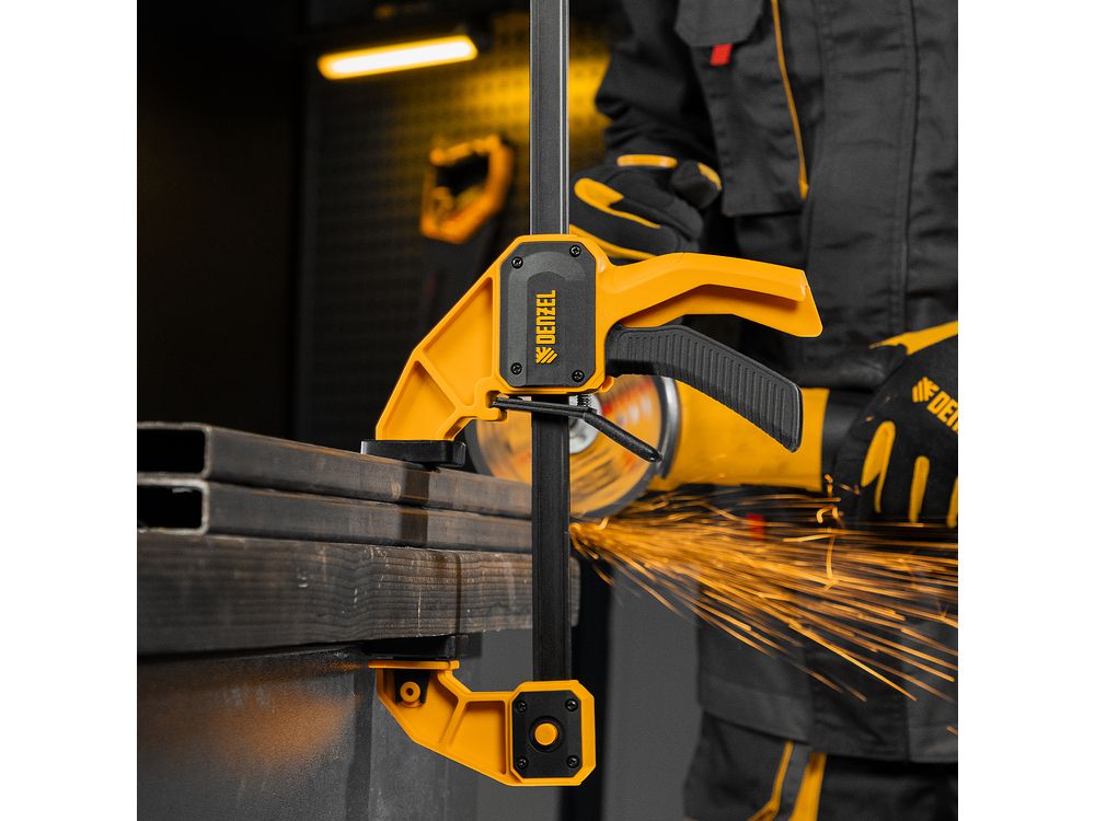 Комфортное использование — струбцина весит всего 710 г, обрезиненная кнопка фиксации обеспечивает удобный захват.