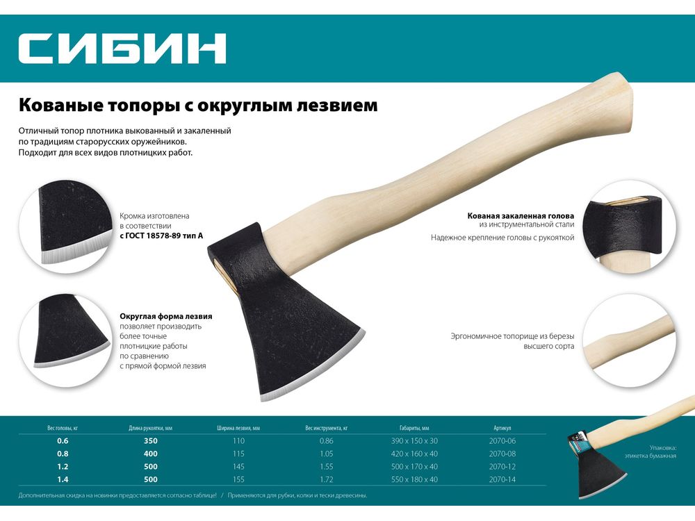 Кованый топор с округлым лезвием СИБИН 1400 г-52