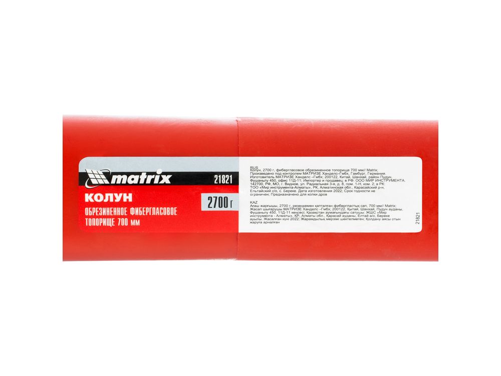 Колун Matrix 21821 с полотном массой 2700 г и фибергласовым обрезиненным топорищем длиной 700 мм предназначен для колки крупных дров. С тыльной стороны рабочей части имеется небольшой боек, который можно использовать вместо кувалды.