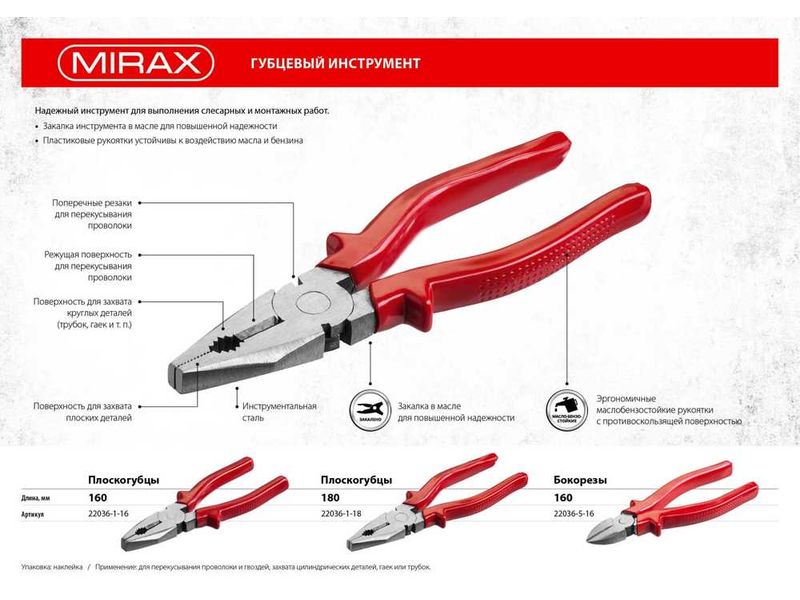 Губцевый инструмент MIRAX промышленного назначения, предназначены для работы в тяжелых индустриальных условиях, широко используются в промышленности, транспорте, коммунальном секторе, автохозяйствах, автосервисах и в личных гаражах и мастерских для захвата и удерживания мелких предметов, перекусывания проволоки средней твердости и других слесарных работ..