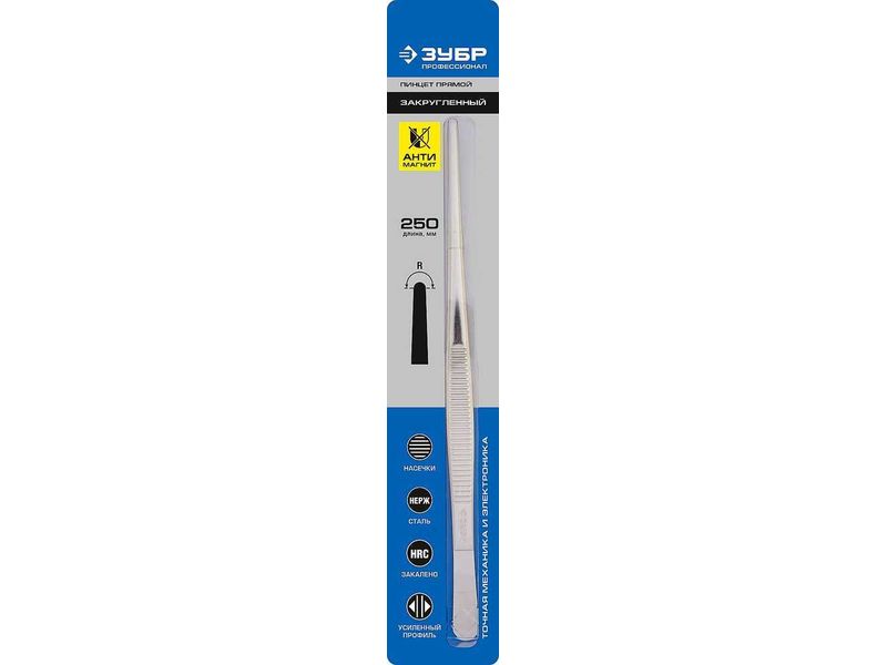 Пинцет ЗУБР д/электроники и точной механики, нерж. сталь, антимагнит., прямой, закругленные губки, 250мм