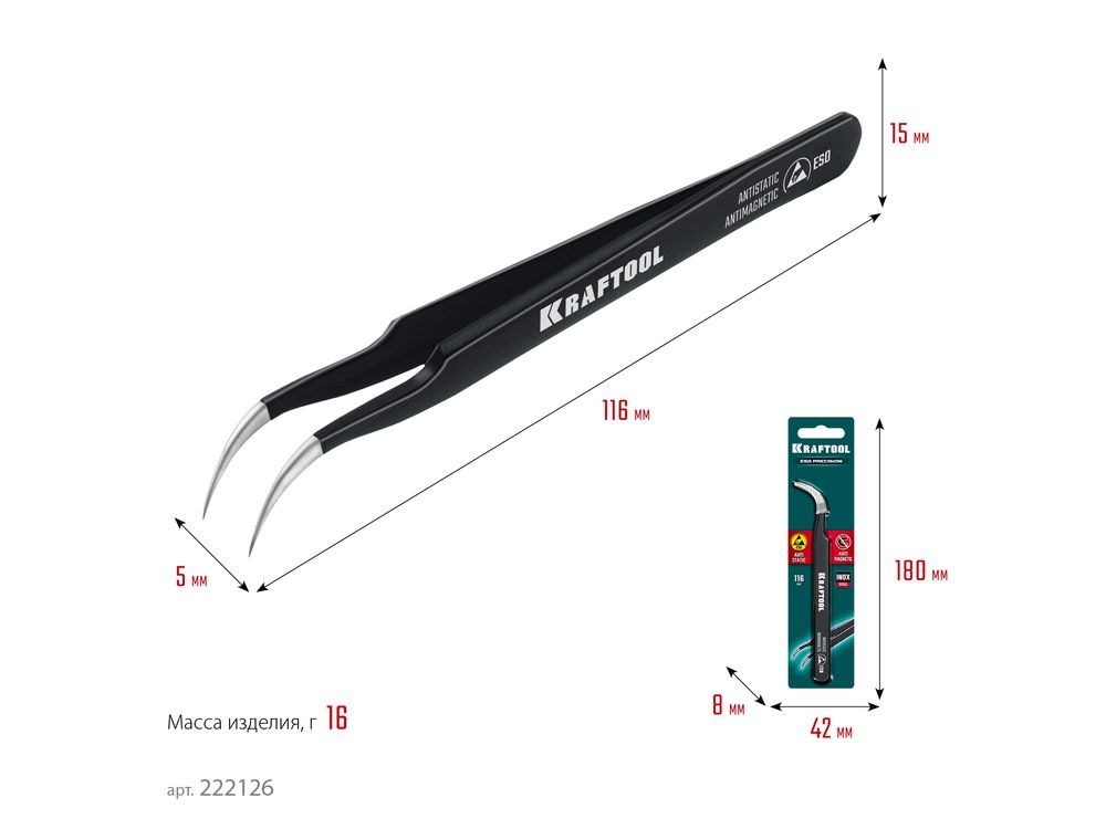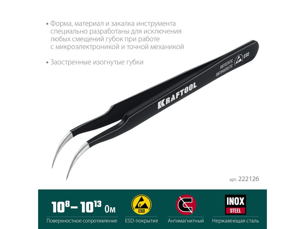KRAFTOOL изогнутый 116 мм, Антистатический антимагнитный прецизионный пинцет (222126)