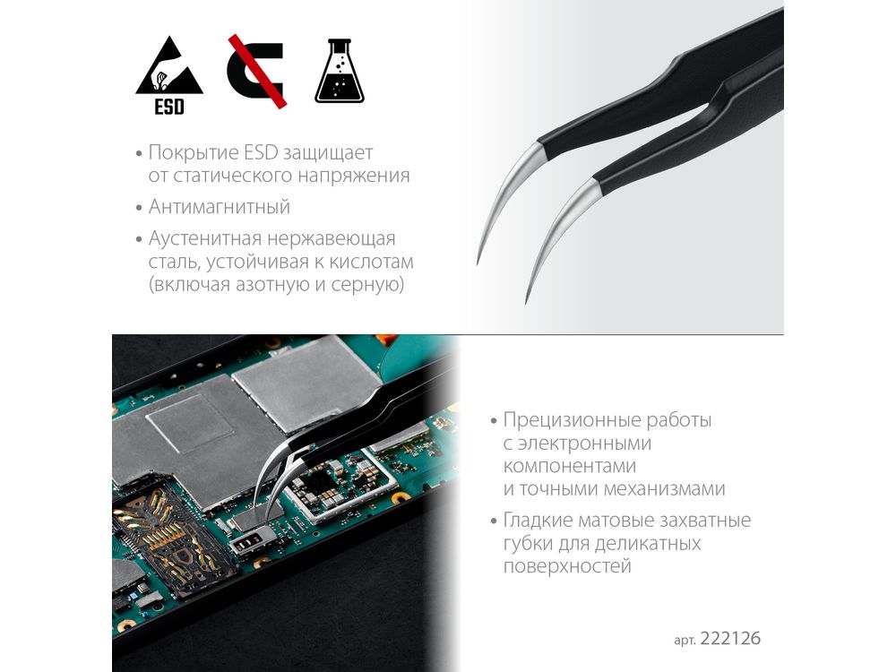 Прецизионный пинцет изготовлен из антимагнитной нержавеющей стали. Специальное покрытие ESD защищает от электростатического разряда