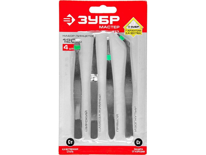 Набор ЗУБР: Пинцеты, нержавеющая сталь, прямой, заостренные губки, изогнутый, самозажимной прямой, плоские и широкие губки, 120мм