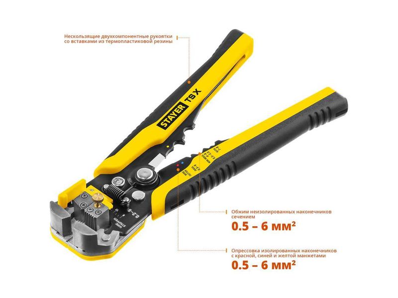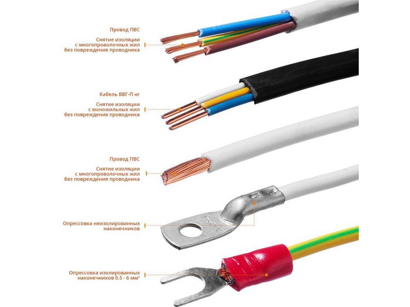 Обжим изолированных наконечников 0,5-6 мм, неизолированных наконечников 0.5-2.5, 4-6 мм.