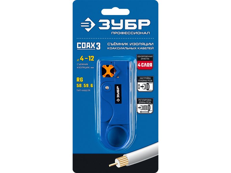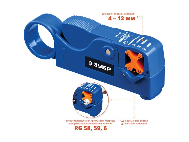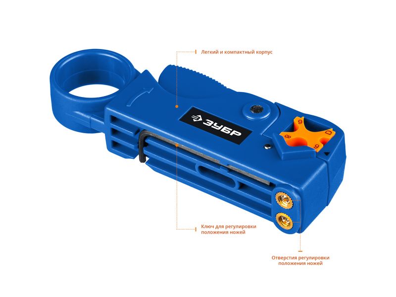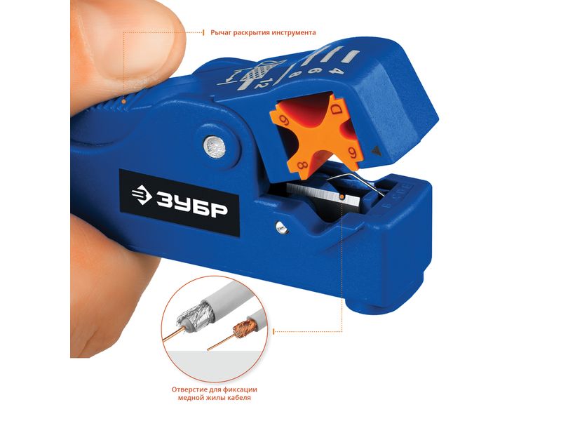 Съёмник изоляции коаксиальных кабелей ЗУБР изготовлен из высококачественной стали с закалкой рабочих поверхностей. Служит для быстрой и безопасной зачистки проводов. Инструмент широко используется профессионалами в сфере электромонтажных работ.