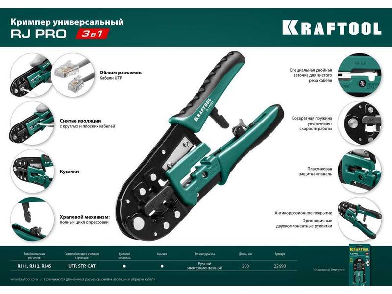 Кримпер универсальный KRAFTOOL изготовлен из высококачественной инструментальной стали с закалкой рабочих поверхностей, предназначен для профессионального применения. Обладает повышенным ресурсом, обеспечивает наивысшее качество электромонтажных работ.