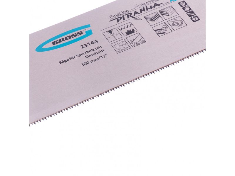 Пила для фанеры с запилом Gross PIRANHA 23144 с полотном размером 300 мм / 12, с калеными зубьями с шагом 11-12 TPI и 3D-заточкой, используется для распиловки древесины, фанеры, ДВП и ПВХ в продольном и поперечном направлении. Характеризуется высокой производительностью. Рабочая кромка с мелкими зубьями выполняет ровный гладкий рез. Запил в передней части полотна облегчает работу с заготовками. Пила будет полезна в столярной мастерской.