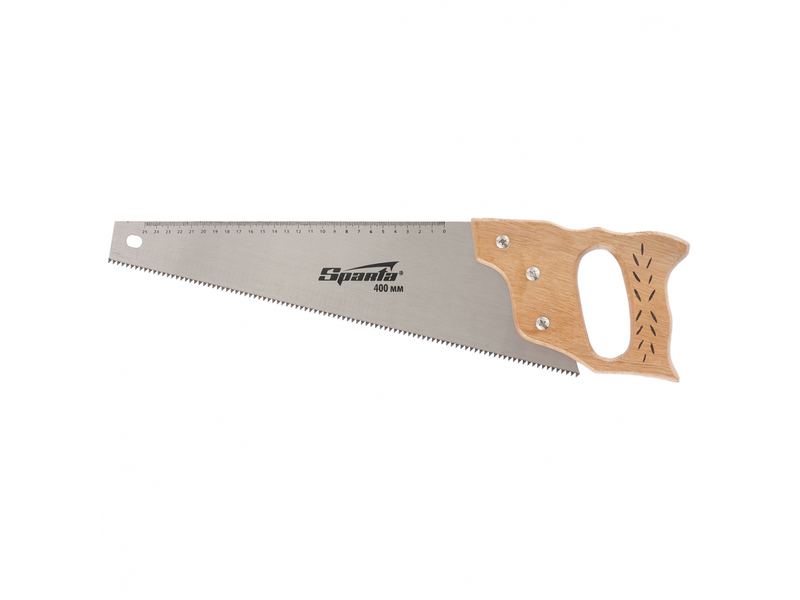 Ножовка по дереву Sparta 231855 с полотном длиной 400 мм, с калеными зубьями с шагом 7-8 TPI, с линейкой и деревянной рукояткой, предназначена для продольно-поперечного распиливания древесины. Благодаря зубьям с 2D-заточкой подходит для двухстороннего реза. Режущую кромку можно перетачивать. На полотно нанесена измерительная шкала, позволяющая производить замеры, не тратя время на поиск линейки. Ножовка используется в столярном и плотницком деле, а также полезна дома и на даче.