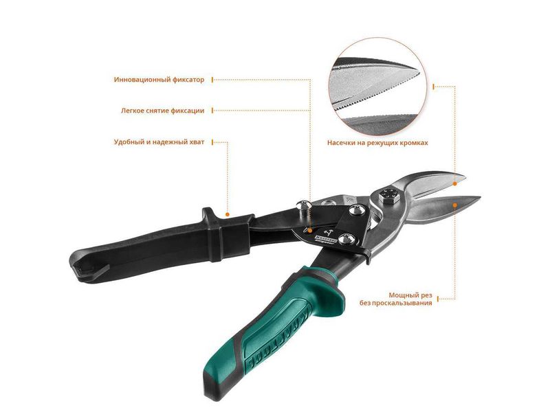Преимущества Мощный двухрычажный механизм Высококачественная хроммолибденовая сталь Индукционная закалка лезвий до 62–65 HRC Насечки на режущих кромках препятствуют соскальзыванию материала в процессе реза Удобный и надежный захват Инновационный фиксатор: легкое снятие фиксации сжатием рукояток, фиксация одной рукой Высокомощный рычажный механизм обеспечивает эффективный точный рез Использование для точного прямого, левого, правого и фигурного резов для сталей повышенной твердости, нержавеющей стали и цветных металлов
