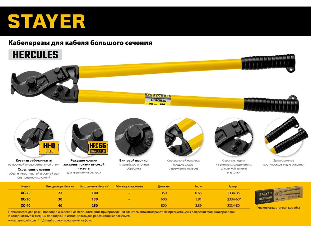 Кабелерезы STAYER изготовлены из высококачественной стали и предназначены для перекусывания неармированного одножильного или многожильного кабеля из цветных металлов (Cu + Al) без деформации и замятия краев. Максимальный диаметр кабеля 25мм.