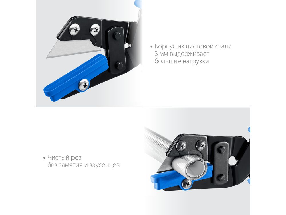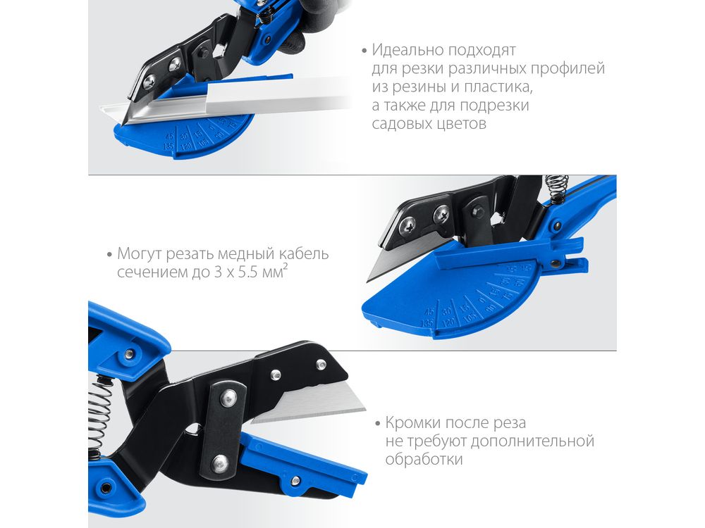 Универсальный (незаменимый) инструмент для чистого реза теперь со сменным лезвием. Идеально справляется с резкой различных профилей из резины и пластика, поможет бережно подрезать садовые цветы. Ножницы способны резать даже медный кабель сечением до 3х5,5 мм. Сменная площадка для резки под различными углами уже в комплекте.