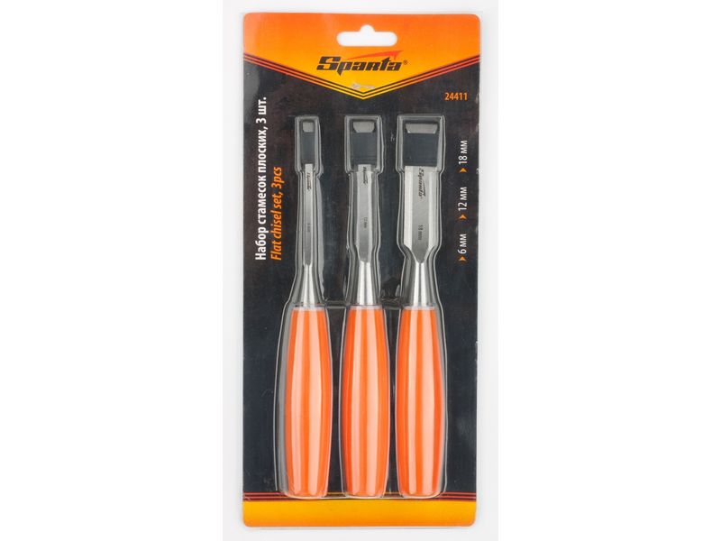 Набор Sparta 24411 из 3 плоских стамесок с полотнами шириной 6, 12 и 18 мм предназначен для ручной обработки дерева — зачистки кромок и гнезд, снятия фасок, нанесения декоративной резьбы. Угол заточки составляет 20-35° — режущие кромки снимают тонкую стружку, что обеспечивает точность и аккуратность работ. Набор используется в столярном и плотницком деле, пригодится и в домашней мастерской.