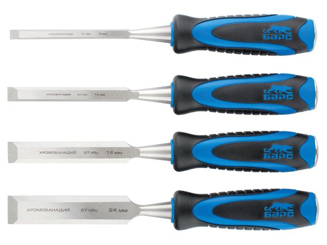 Набор Барс 24452 из 4 плоских долот-стамесок с шириной режущих частей 8-12-18-24 мм, с двухкомпонентными рукоятками и металлическими затыльниками, пригодится столярам и плотникам для выборки углублений, снятия фасок, формирования шипов, а также выполнения других работ по обработке древесины. При использовании киянки или небольшого молотка долото-стамеска легче врезается в дерево, что позволяет получить прямоугольный паз с аккуратным контуром.