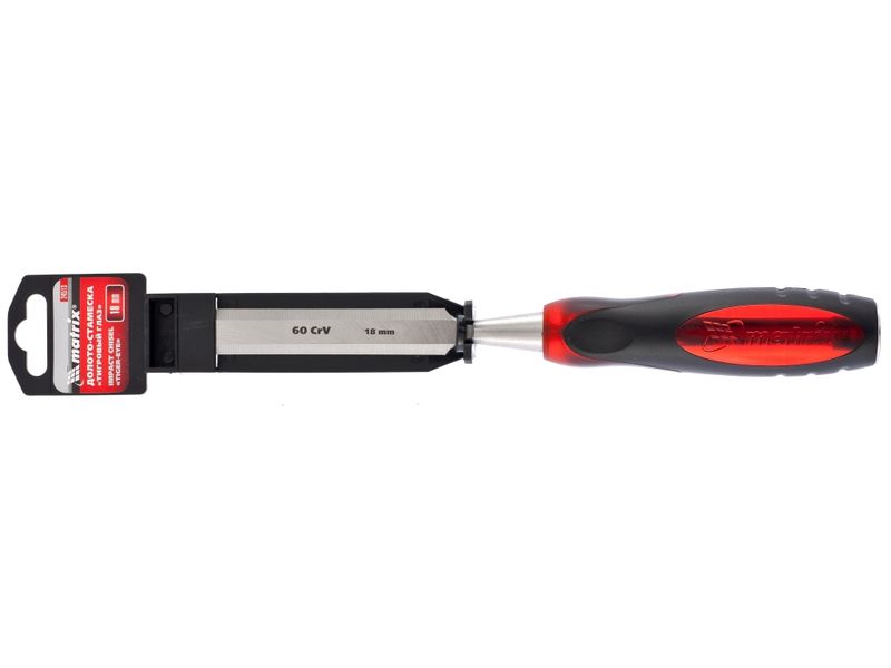 Долото-стамеска Matrix «Тигровый глаз» 24513 с полотном шириной 18 мм и двухкомпонентной обрезиненной рукояткой используется в столярном и плотницком деле, в производстве мебели. Позволяет вырезать углубления, формировать пазы, зачищать шипы и гнезда, снимать фаски. Инструмент выдерживает удары киянкой или молотком, т. к. металлический затыльник защищает его от деформации. Долото относится к профессиональному ручному инструменту, но может применяться и в домашних условиях.