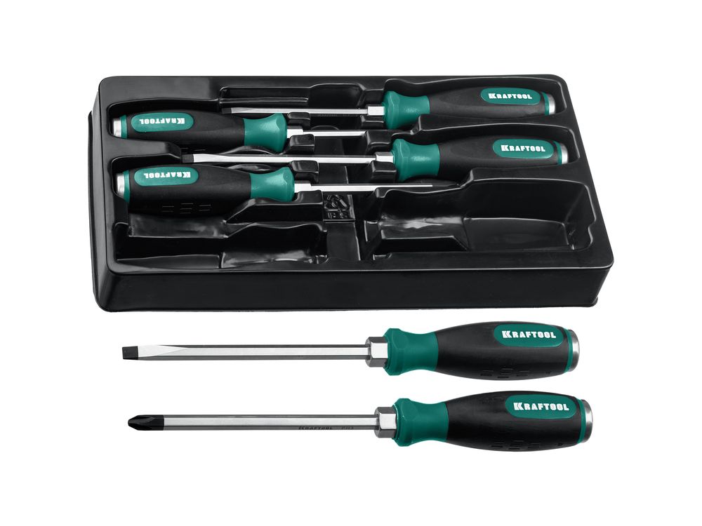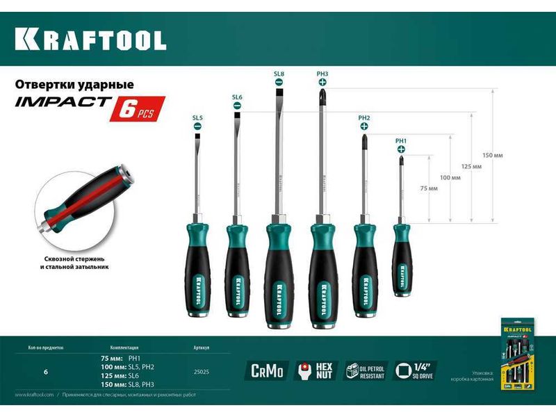 Набор отверток ударных "IMPACT", KRAFTOOL 25025, сквозной стержень из Cr-Mo-V стали, SL4,5x90мм, SL5,5x100мм, SL6,5x125мм, PH1x80мм, PH2x100мм