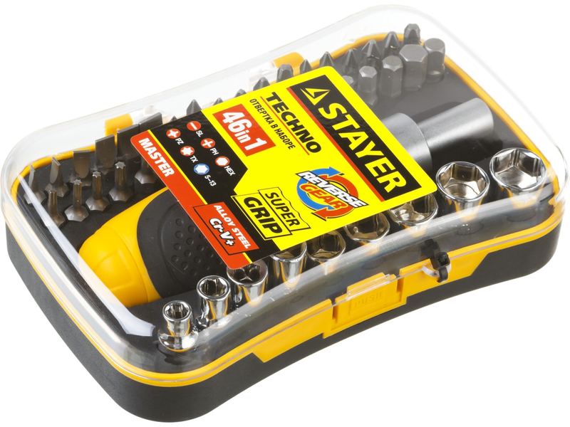 Набор STAYER "MASTER" "ТECHNO": Отвертки, реверс отвертка, биты 35шт, адаптер для торц голов, торц голов 9шт, 46 предм